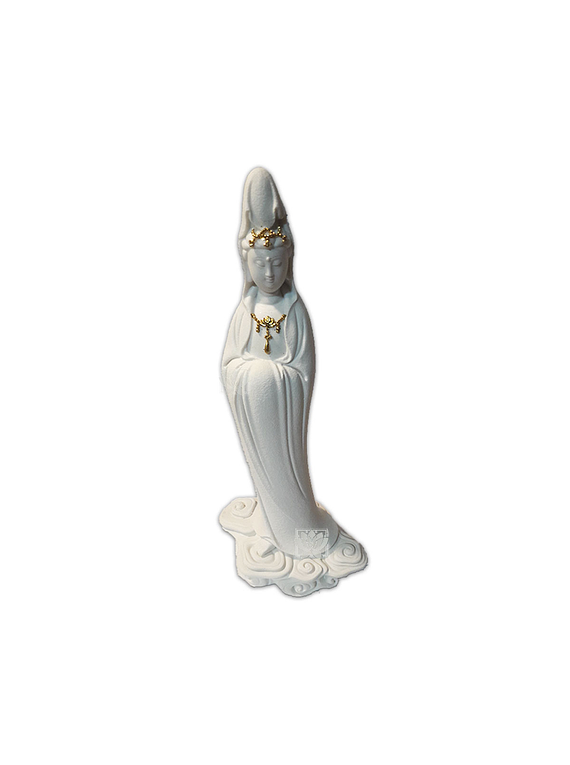 Diosa Quang Ying en Poliresina Grande 16.5", consta de 1 piezas de diseño en poliresina con rasgos y detalles en dorados, marcados de la diosa Quang Ying.