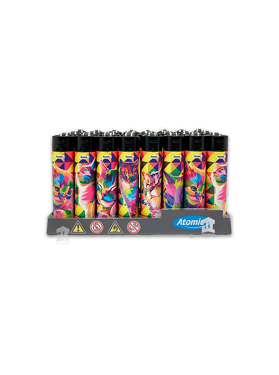 Display de encendedores Recargables (flint) marca Atomic, cada display contiene 24 encendedores con diseños, todos absolutamente certificados. 6 Diseños divertidos.