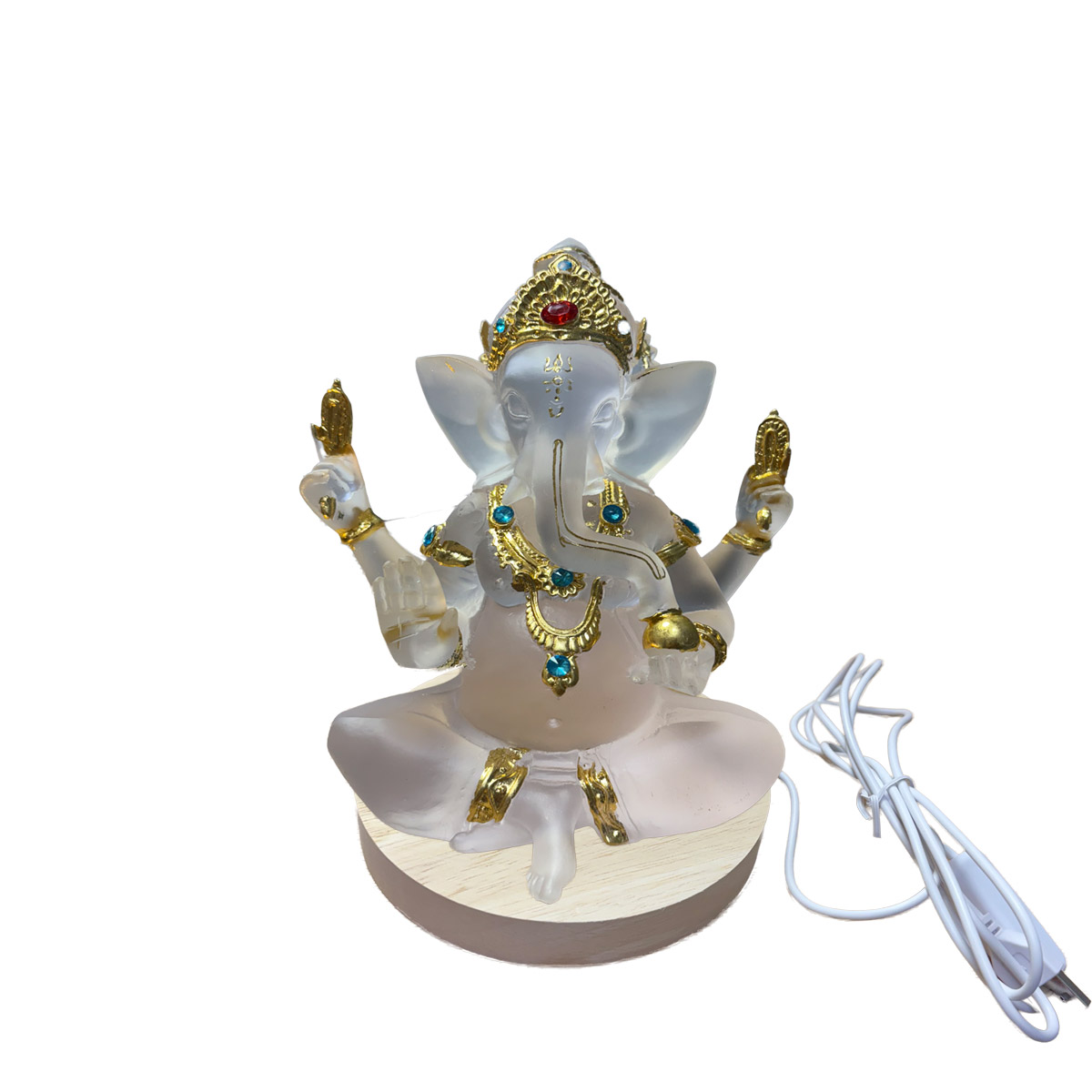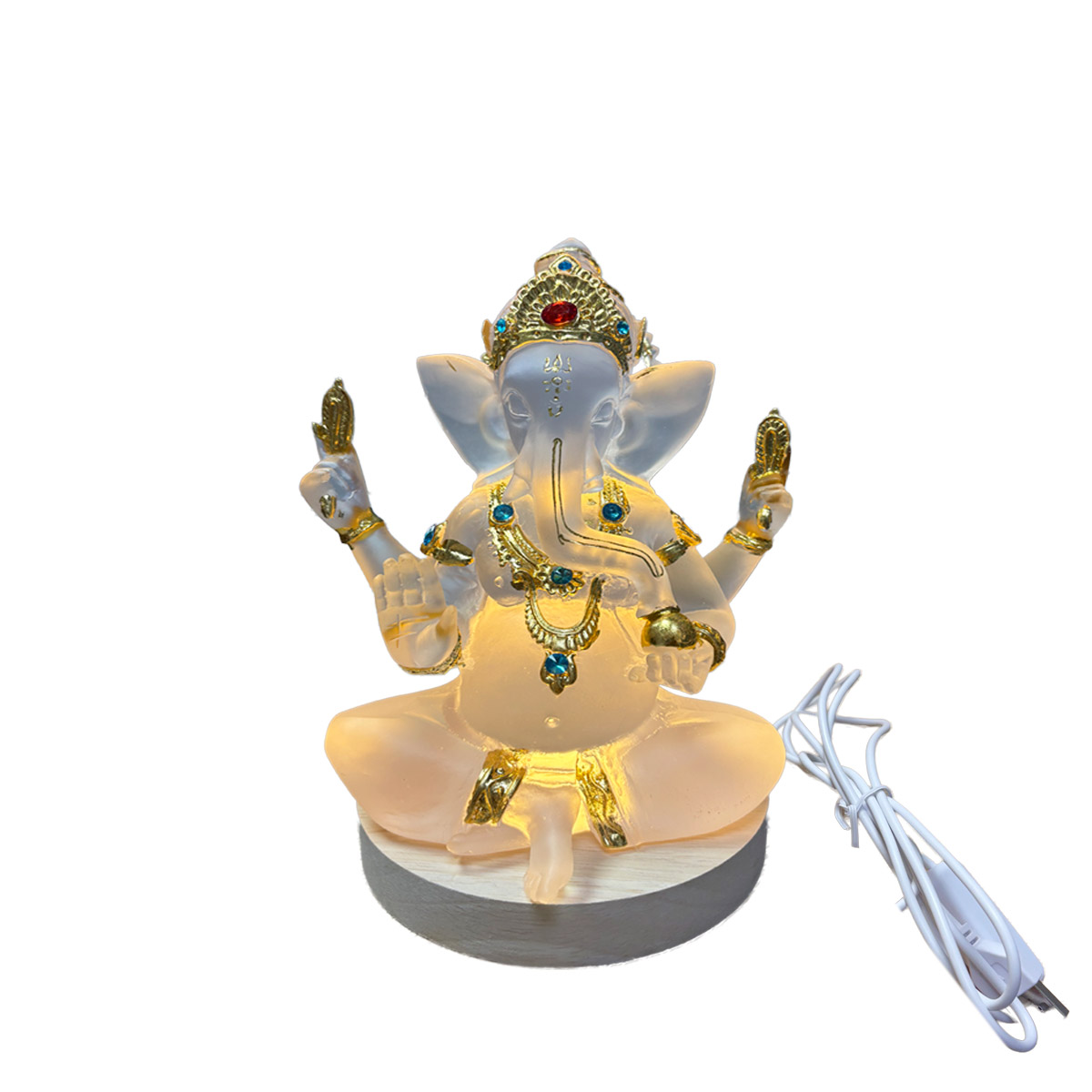 Contiene: 1 figura de Ganesh, Base y cable con interruptor y salida usb .
