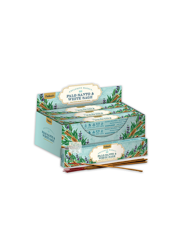 Incienso Exclusivos Tulasi Masala Palo Santo & Salvia Blanca.Utilizado para limpiar las malas energías del Hogar.