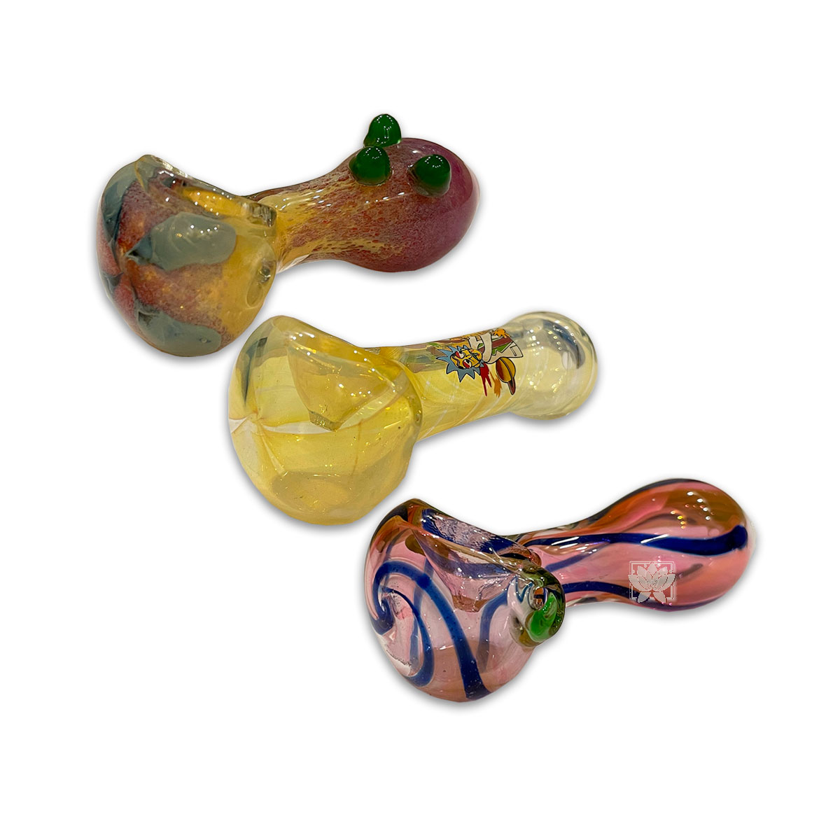 Pipa Pyrex Grande 3.5" Diseño Surtidos, resistente a las altas temperaturas generadas por la combustión. Esta pipa mantiene todo el sabor y olor al fumar, ya que su material no desprende restos tóxicos o nocivos. Ideal para compartir de buenos momentos con tus amigos.