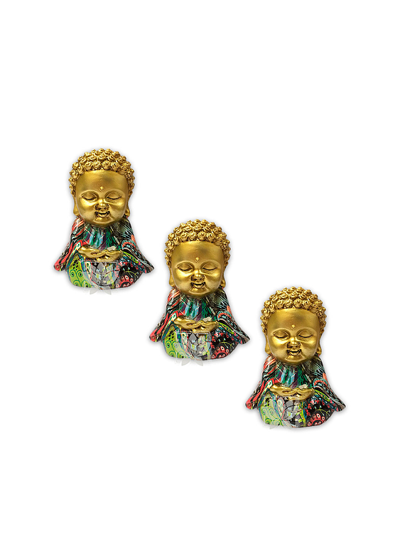 Set Figura Buda Meditando 3,5", poliresina con rasgos y detalles marcados de Buda en dos colores.